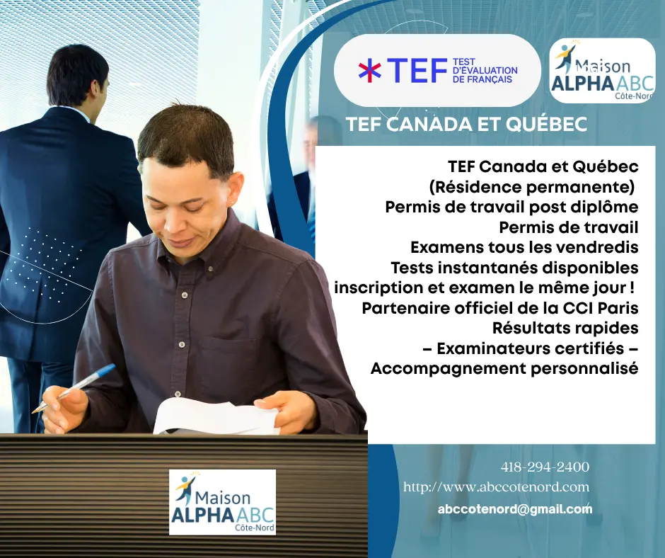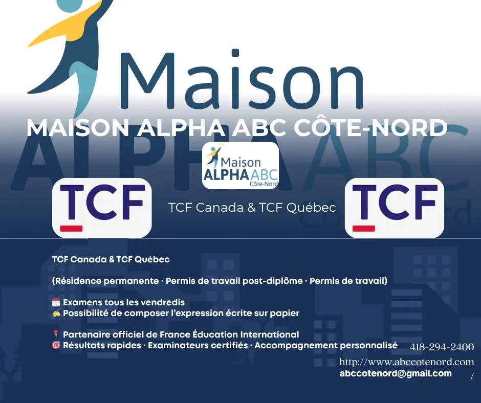 Maison Alpha ABC Côte-Nord à Baie-Comeau est un centre accrédité pour les examens TEF (Test d’Évaluation de Français) et TCF (Test de Connaissance du Français).